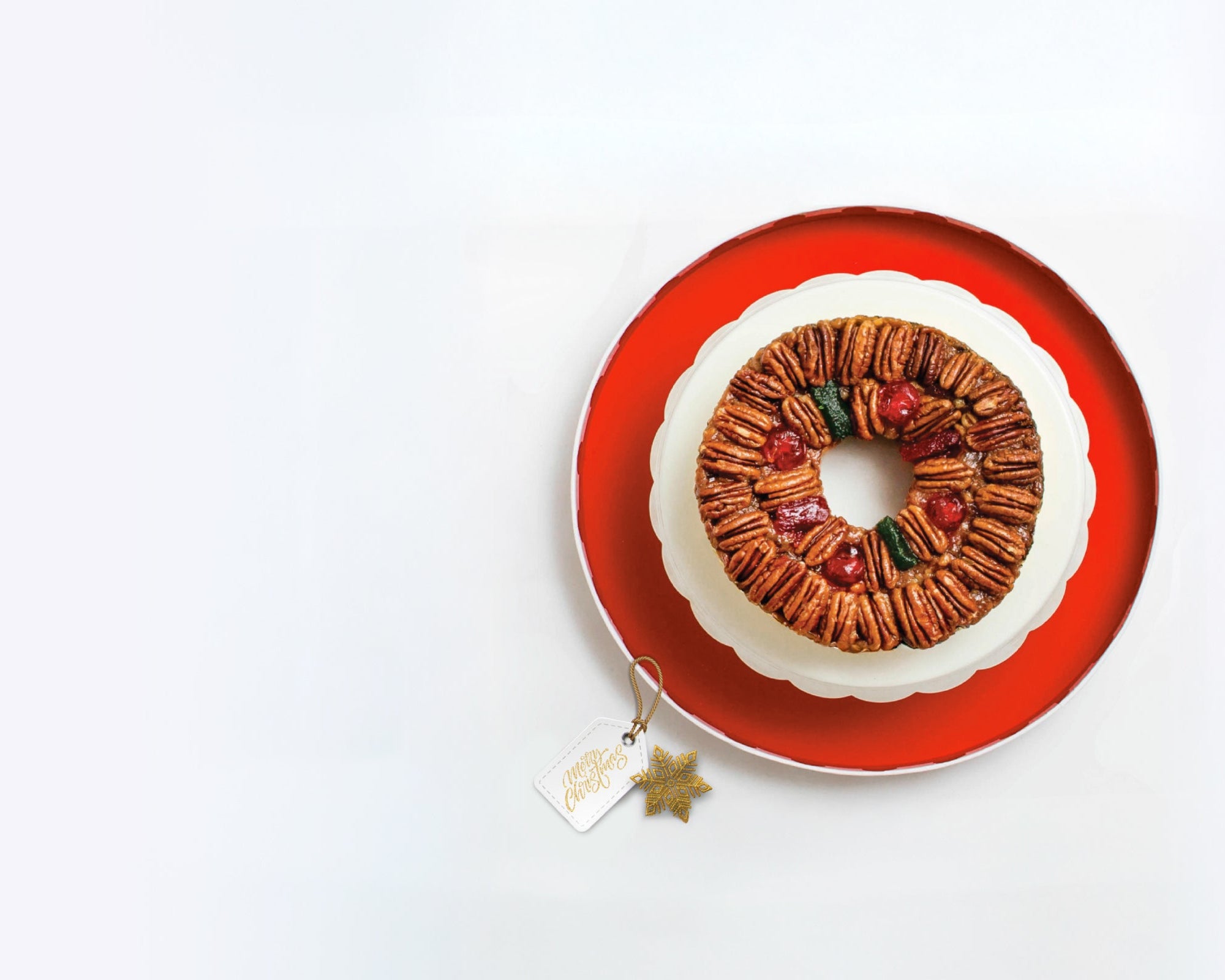 Widely recognized for its superior taste and texture, our DeLuxe® is made with authentic North American pecans, Oregon cherries, California raisins, and Costa Rican pineapple. Hand-decorated with mammoth pecan halves and glacéed fruit, our fruitcake is a feast for all the senses.